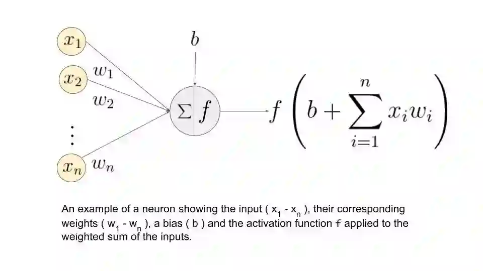 上图中(x_1, ..., x_n)是信号向量,它和权重(w_1, ..., w_n)相乘。然后再累加(即求和 + 偏置项 b)。最后,激活函数 f 应用于累加的总和。