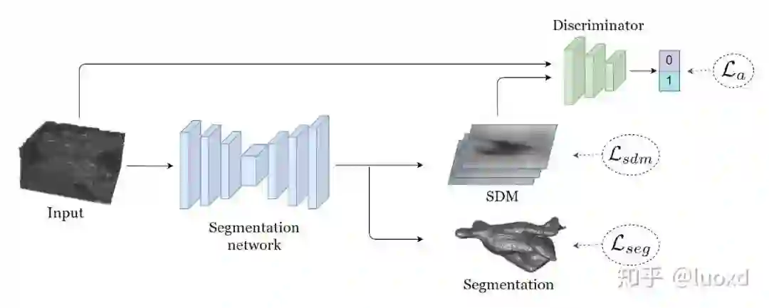 总结: 这篇文章采用了一个常用的多任务网络结构,同时进行图像分割和带符号的距离图回归(引入了形状和位置先验),并用判别器来作为正则化项,与以前常见用判别器做正则化项方法不同的是,本文的判别器输入时带符号的距离图和原图,而不是分割结果和原图。这样设计可以使整个未标记数据集的预测分布平滑,并引入了很强的形状和位置先验信息,保证分割结果的稳定性和鲁棒性。