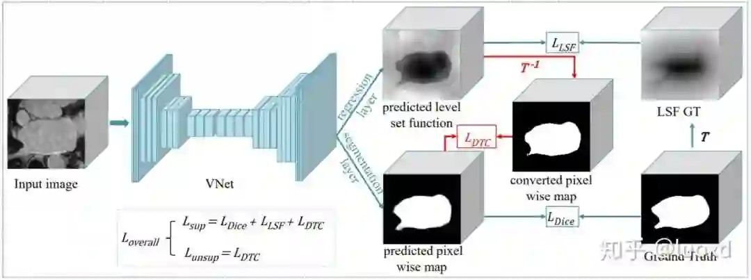 总结: 前面五篇文章主要还是基于数据层面和模型层面的扰动来构建一致性来进行半监督学习。本文(DTC)从任务层面来构建了一致性进行半监督学习,与SASSNet一样本文采用了一个多任务网络结构,同时进行分割和水平集函数回归,不同的是SASSNet用判别器来进行正则化(data-level),而本文利用两个任务之间的表示差异来构建一致性(task-level)。与Mean Teacher等模型需要多次前向传播相比,DTC模型简单,计算开销也不大,除此之外,还有可以构建许多跨任务的一致性进行全监督,半监督或者是跨域(DA)学习。