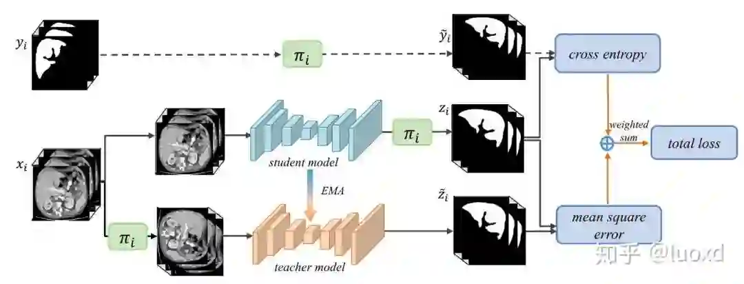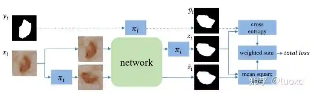 总结:这篇文章的方法类似于Temporal ensembling for semi-supervised learning(ICLR2017)通过给输入数据加扰动(transformation)来正则化模型 (一次迭代模型需要前向传播两次,输入分别是未变化的图像和变化后的图像,然后变化后图像得到的结果进行反变换然后构建这两个预测结果的一致性损失),直接将未标注数据利用起来,想法很简洁但效果很不错。