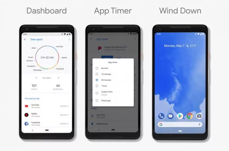 它还推出了一款新的 Android Dashboard,可以让用户通过手机或平板电脑来监控他们的时间。 在设置中可以找到这个仪表板,可以让人们看到他们已经解锁了多少次手机,使用应用程序已经花费了多长时间,以及通知的详细分解。 Android P 还可以让用户设定他们每天使用应用程序的时间,一个叫做 Shush “嘘”的新功能会让手机在面朝下放在桌子上时不会打扰。