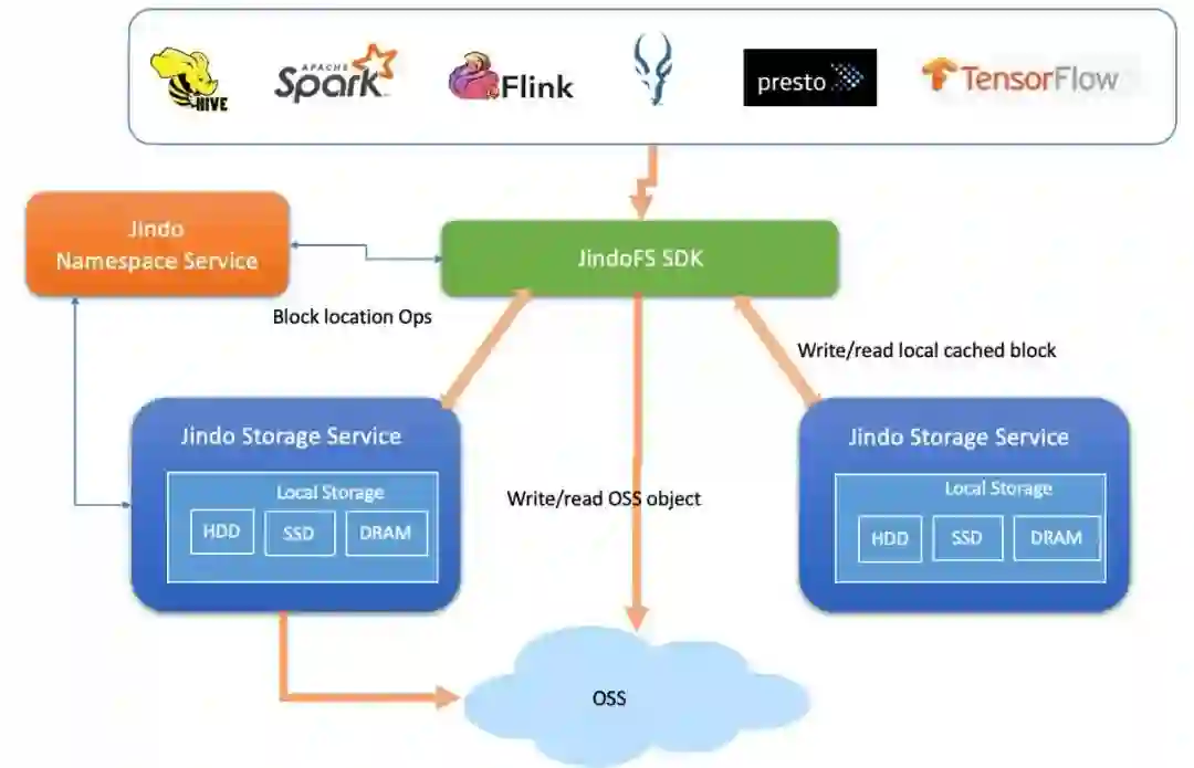 数据湖架构对大数据计算的另外一个影响是存/算分离。存储和计算分离,使得存储和计算在架构上解耦,存储朝着大容量低成本规模化供应,计算则向着弹性伸缩,丰富性和多样化向前发展,在整体上有利于专业化分工和大家把技术做深,客户价值也可以实现最大化。但是这种分离架构带来一个重要问题就是,存储带宽的供应在一些情况下可能会跟计算对存储带宽的需求不相适应。计算要跨网络访问存储,数据本地性消失,访问带宽整体上会受限于这个网络;更重要的是,在数据湖理念下,多种计算,越来越多的计算要同时访问数据,会竞争这个带宽,最终使得带宽供需失衡。我们在大量的实践中发现,同一个OSS bucket,Hive/Spark数仓要进行ETL,Presto要交互式分析,机器学习也要抽取训练数据,这个在数据湖时代之前不可想象,那个时候也许最多的就是MapReduce作业了。这些多样化的计算,对数据访问性能和吞吐的需求却不遑多让甚至是变本加厉。常驻的集群希望完成更多的计算;弹性伸缩的集群则希望尽快完成作业,把大量节点给释放掉节省成本;像Presto这种交互式分析业务方希望是越快越好,稳定亚秒级返回不受任何其他计算影响;而GPU训练程序则是期望数据完全本地化一样的极大吞吐。像这种局面该如何破呢?无限地增加存储侧的吞吐是不现实的,因为整体上受限于和计算集群之间的网络。有效地保证丰富的计算对存储带宽的需求,业界早已给出的答案是计算侧的缓存。Alluxio一直在做这方面的事情,JindoFS核心定位是数据湖加速层,其思路也同出一辙。下面是它在缓存场景上的架构图。