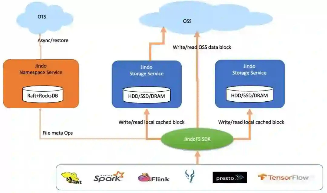 如上图示,是JindoFS在block模式下的系统架构,整体上重用了JindoFS缓存系统。在这种模式下,文件数据是分块存放在OSS上,保证可靠和可用;同时借助于本地集群上的缓存备份,可以实现缓存加速。文件元数据异步写入到阿里云OTS数据库防止本地误操作,同时方便JindoFS集群重建恢复;元数据在正常读写时走本地RocksDB,内存做LRU缓存,因此支撑的文件数在亿级;结合元数据服务的文件/目录级别细粒度锁实现,JindoFS在大规模高并发作业高峰的时候表现比HDFS更稳定,吞吐也更高。我们用HDFS NNBench做并发测试,对于最关键的open和create操作,JindoFS的IOPS比HDFS高60%。在千万级超大目录测试上,文件listing操作比HDFS快130%;文件统计du/count操作比HDFS快1X。借助于分布式Raft协议,JindoFS支持HA和多namespaces,整体上部署和维护比HDFS简化太多。在IO吞吐上,因为除了本地磁盘,还可以同时使用OSS带宽来读,因此在同样的集群配置下用DFSIO实测下来,读吞吐JindoFS比HDFS快33%。