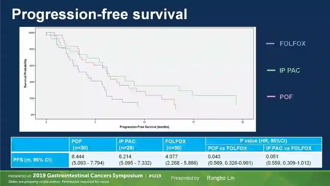 图 12. FOLFOX、IP PAC(紫杉醇腹腔灌注+FOLFOX)、POF(紫杉醇静脉注射+FOLFOX)一线治疗晚期胃癌的无疾病进展时间(LIN R, et al. ASCO-GI 2019)