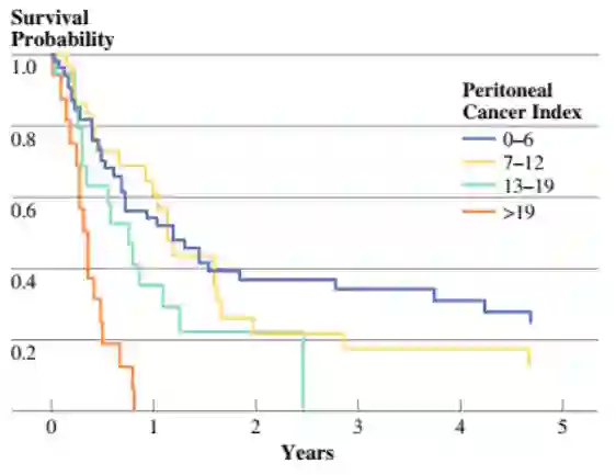 图4. 在完全CRS患者中不同PCI评分的生存曲线(Glehen O, et al. Ann Surg Oncol. 2010)