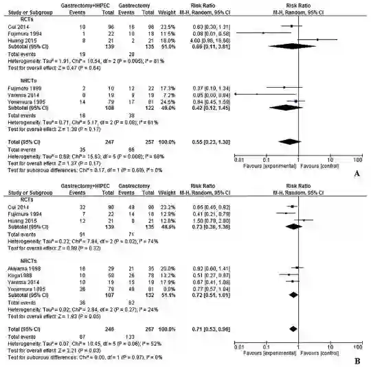 目前在HIPEC预防胃癌腹膜转移方面同样缺乏前瞻性随机对照Ⅲ期研究。2017年发表的来自德国的荟萃分析,共纳入11项随机对照研究和21项非随机对照研究(2520例患者)。在没有腹膜转移的患者中,3或5年生存率HIPEC组优于对照组(图9)。正在进行的德国Ⅱ期研究HIPEC-Stomach研究选择T2~4NanyM0患者,分为术前灌洗细胞学阳性、术前灌洗细胞学阳性+HIPEC(丝裂霉素+顺铂)以及术前灌洗细胞学阴性三组,主要研究终点是腹膜无复发生存时间。另一项正在进行的是来自法国的Ⅲ期GSTRICHIP研究,入组T3~4和/或N+和/或细胞学阳性胃腺癌患者,术后随机给予或不给予HIPEC(奥沙利铂)治疗。目前仍在招募患者中。这些研究都值得期待。