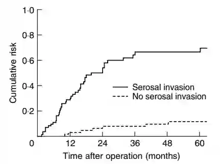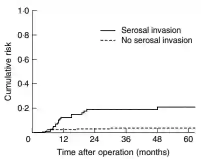 图8. 肠型胃癌浆膜浸润与否的腹膜复发风险曲线(Roviello F, et al. Br J Surg. 2003)