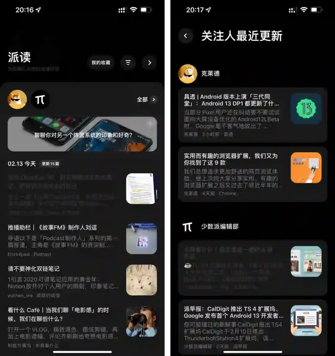 我们也用「派读」代替了客户端中原有的「关注」时间流,在「派读」界面的最上方,你可以看到关注的创作者中哪些人有新的动态,点击即可查看他们发布 / 点赞的文章、参与的讨论等等。如果你关注的话题在少数派上有新的「一派」讨论活动,也会呈现在这里,期待你的每一次发言。