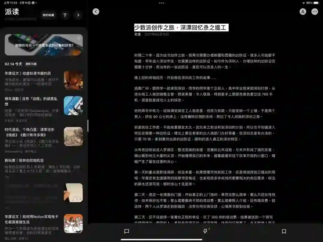 为了保证内容质量,「派读」中的文章均由少数派编辑部精心挑选与整理。如果你在读完少数派首页和 Matrix 社区中的文章之后感到意犹未尽,那就来「派读」看看吧。为了不给你增加过多负担,「派读」的推荐数量将会保持克制,不会成为你的另一个无穷无尽的时间流。当然,你也可以在「派读」界面下方找到往期推荐的入口,不错过每一期精彩文章。
