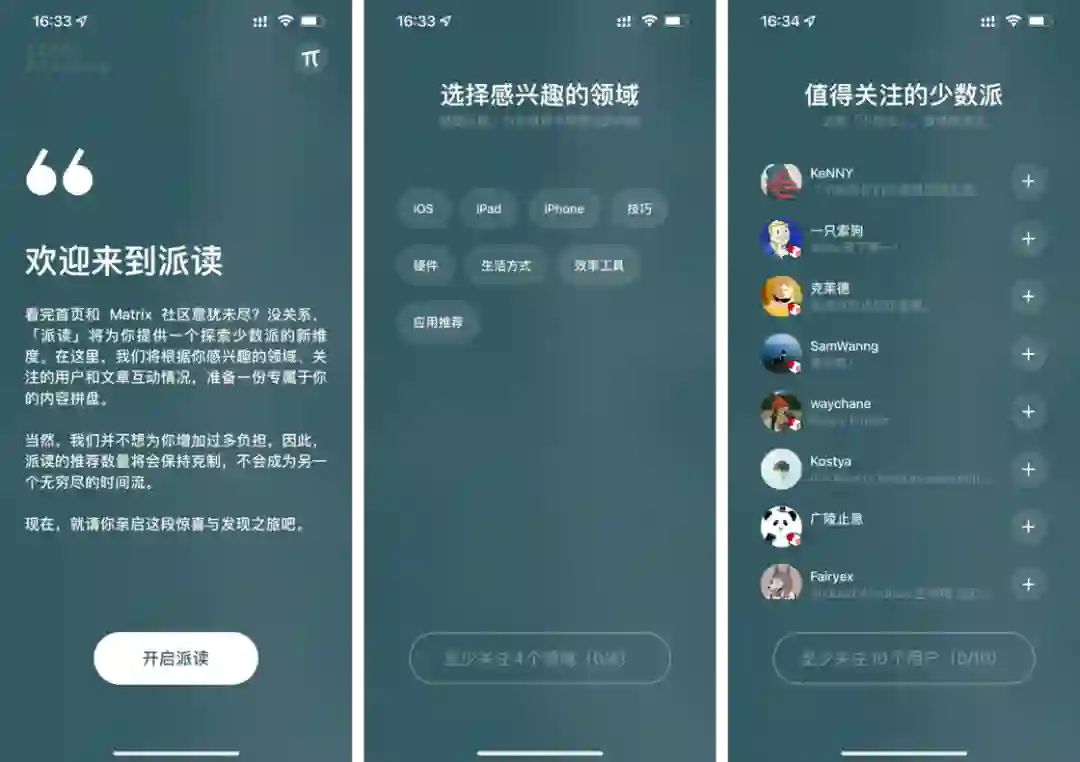 在最新版的少数派客户端中,前往首页向右滑动,即可进入「派读」界面。初次进入「派读」,你需要选择至少 4 个感兴趣的领域、10 位值得关注的创作者,我们会根据你的选择,将最适合你的内容推送给你。