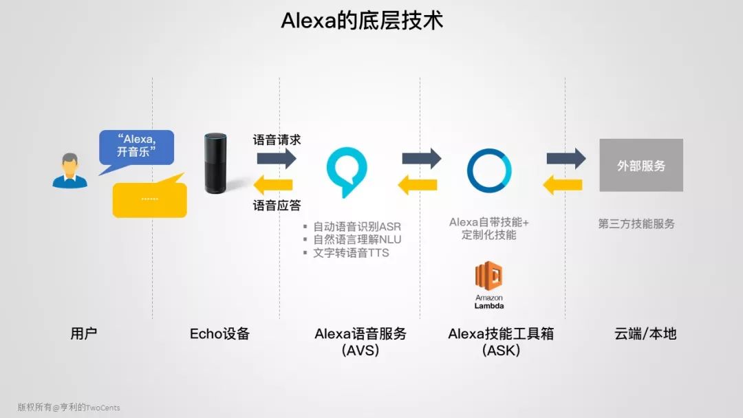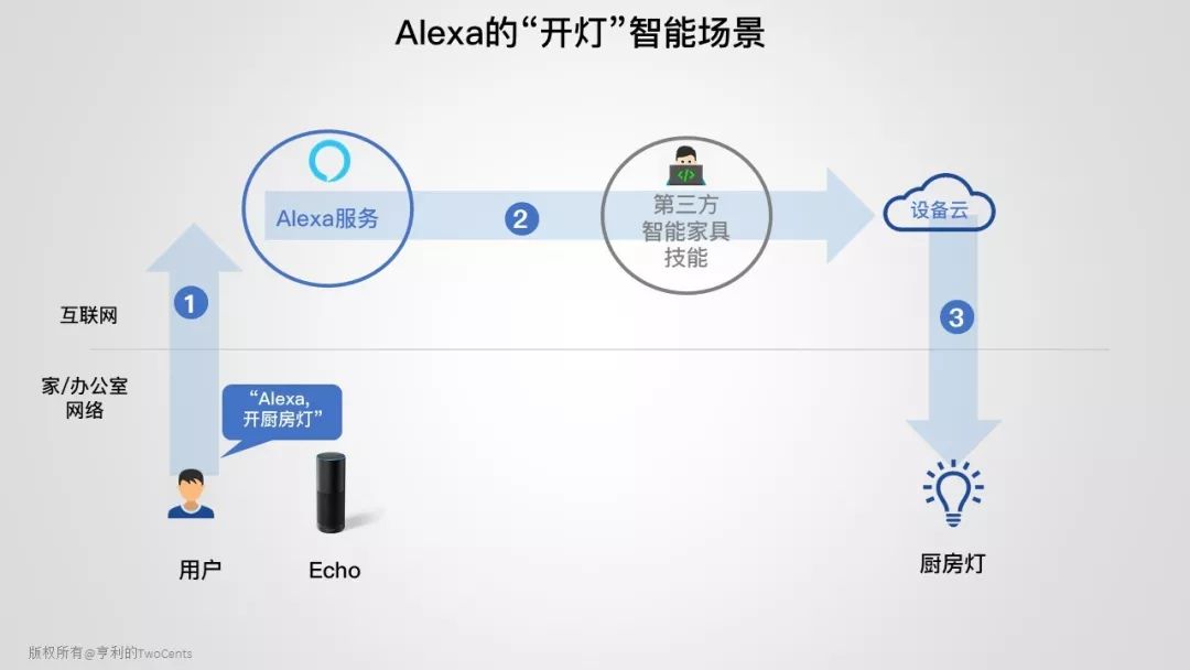 这是一个典型的 Alexa 驱动开灯的场景。当用户发起语音指令,就会传给云端的 Alexa 解析和处理。如果 Alexa 发现使用的不是它内置技能,就会去调用外部第三方开发者的技能,最后发出“开灯”的指令。