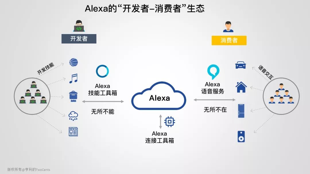 Alexa 主要通过 2 个核心服务连接开发者和消费者构建生态:AVS (Alexa Voice Service) 和 ASK (Alexa Skill Kit)。