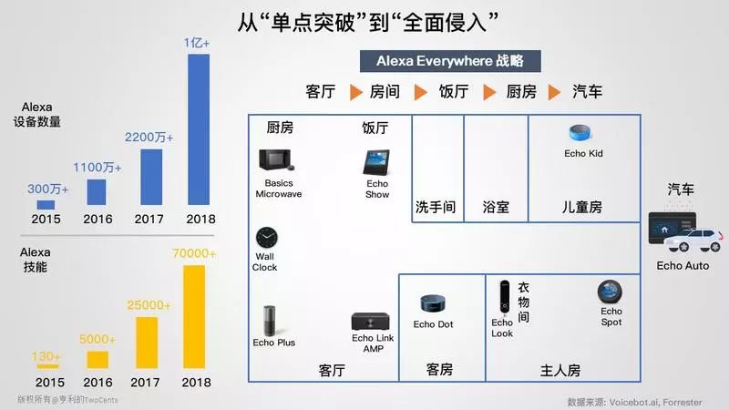 2015 年,Echo 横空出世,以极快地进入智能家居市场,从点到面地爆发。通过精准的产品定位、闪电式的市场策略、开放的生态以及投资布局,建立极高的竞争壁垒。得用户者得天下,Amazon 目标只有一个,就是打造下一代基于语音交互的操作系统。