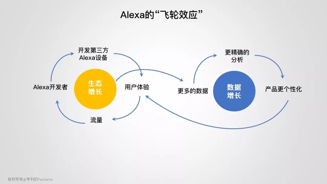 Alexa 的成功主要在产品、市场先机和开放策略。先从 Echo 单点爆发,迅速占领市场,形成第一道“护城河”。然后,利用开放的策略,吸引更多的开发者研发第三方的 Alexa 设备,满足消费者各种场景需求,用户体验不断提升,然后带来更多的流量,吸引更多的开发者进入,打造一个自给自足的生态循环,形成第二道“护城河”。另外,生态的增长,持续产生大量有价值的用户偏好数据,数据的反哺帮助 ML 算法优化,分析更加精确,个性化程度更高,客户的体验更好,形成第三道“护城河”。从用户流量,到开发生态,到数据反哺,持续优化模型,层层递进,形成一个让竞争对手难以复制的巨大壁垒,最终垄断市场。