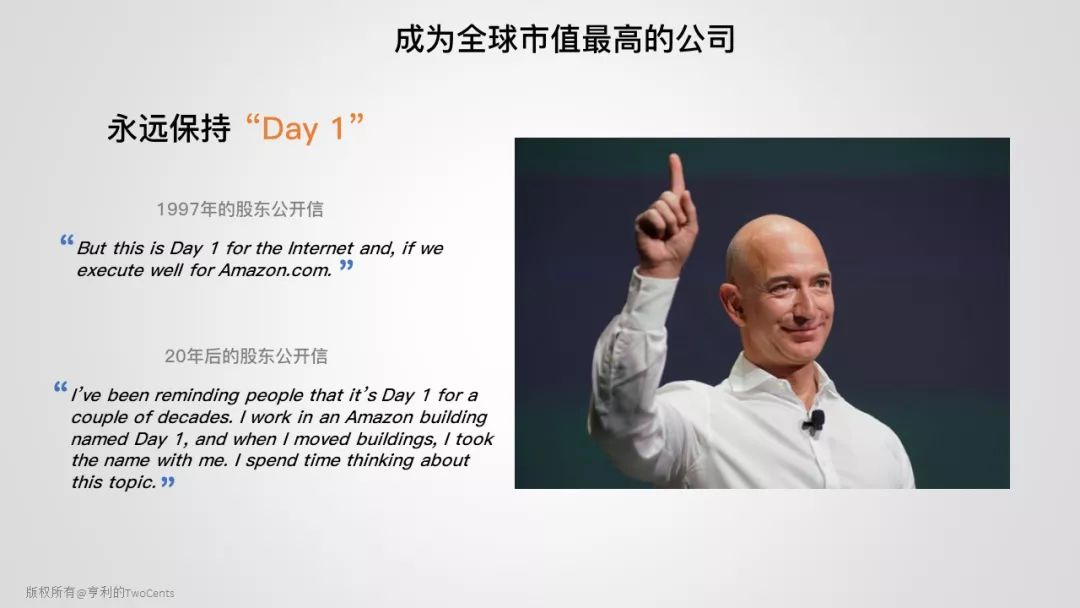 Jeff Bezos 一直有个非常著名的“Day 1”哲学,就是让公司永远保持在一个"Day 1"的状态,他认为一旦到了“Day 2”,就意味着进入停滞期。那如何保持“Day 1”?Jeff 在 2017 年给股东的公开信中提到了 4 个策略:用户至上(Amazon 内部神一般的教条)、抵制形式主义、关注外部趋势和快速决策。