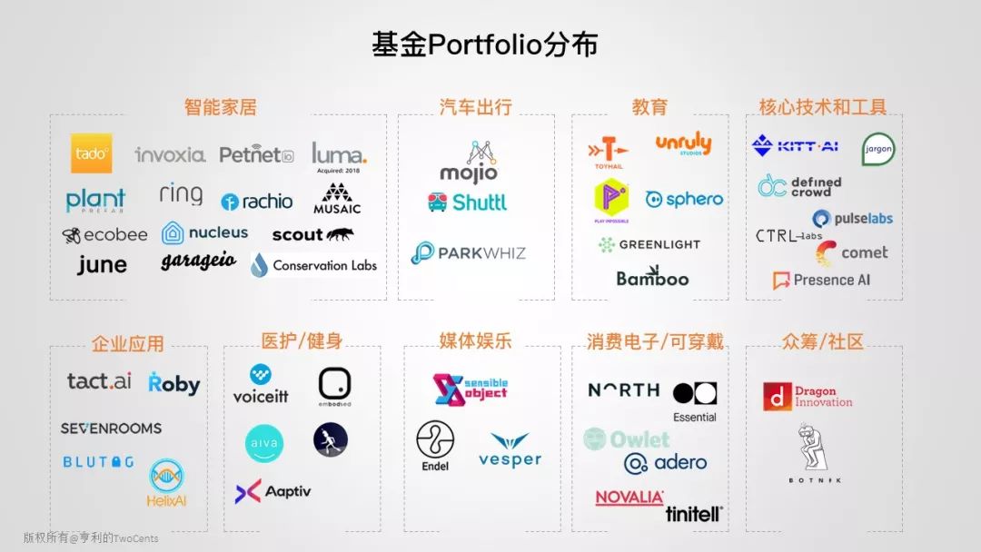 基金的 portfolio 有 3 家来自加拿大,7 家来自欧洲,1 家来自以色列和 1 家来自印度,其他均来自美国地区。领域覆盖了智能家居、汽车出行、教育、医疗护理、企业应用等领域。很明显,智能家居仍然是 Alexa 的重心,从智能冰箱贴、宠物喂食器到安防摄像头,共投了 14 家。其中智能门锁 Garageio、智能门铃 Ring、安全路由器 Luma、智能洒水系统 Rachio 均被收购。儿童教育也是 Alexa 的关注领域,结合语音技术和 IoT,赋能儿童 STEM 教育。