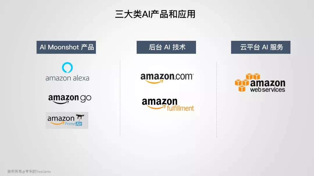 Amazon 的 AI 应用可分为三大类,一类是能“看得见、摸得着”的前沿技术 moonshot 产品,像 Alexa、 Amazon Go 和无人机 Prime Air;一类是“不可见、藏在后台”的 AI 技术,如推荐引擎、仓库机器人和 fulfillment 中心的“最后一公里”;另外就是企业级应用 AWS 云平台,提供 AI 工具和服务,让企业构建自己的 AI 应用。