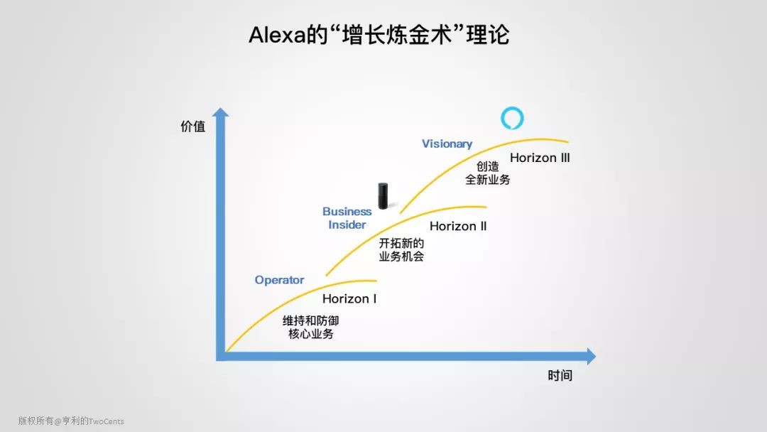根据“The Alchemy of Growth”理论(中文: 增长的炼金术),企业有三个层次的增长。第一个层次是 Operator,维持当前业务的核心竞争力。第二个层次是 Business Builder,开拓新的业务增长模式和解决方案,扩展核心竞争力。第三层次是最高级别 Visionary,也是离公司的 comfort zone 最远的区域,创造独有的解决方案,开拓全新市场,实现业务爆炸性的增长。