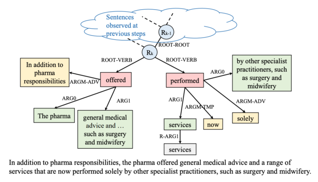 在生成和更新图的步骤中,类似于最近为静态 MRC 任务设计的方法,作者研究了通过语义角色标签(Semantic Role Labeling, SRL)构建知识图。SRL 系统可以检测与句子中的每个谓词(或动词)相关联的参数以及它们如何分类为特定角色。此属性对于处理 MRC 任务至关重要,尤其是对于提取 QA 数据集,其中答案通常是短文本块(例如,实体),此类块通常可以被 SRL 解析器识别为参数。