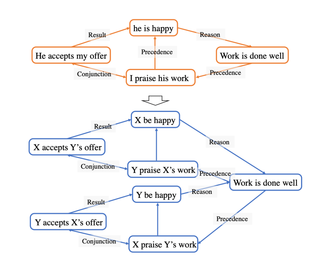 上图是标准化 ASER 知识库的示例。橙色节点和边是来自 ASER 的原始数据,蓝色的是通过将“he”和“she”转换为占位符“PersonX”和“PersonY”的归一化图。