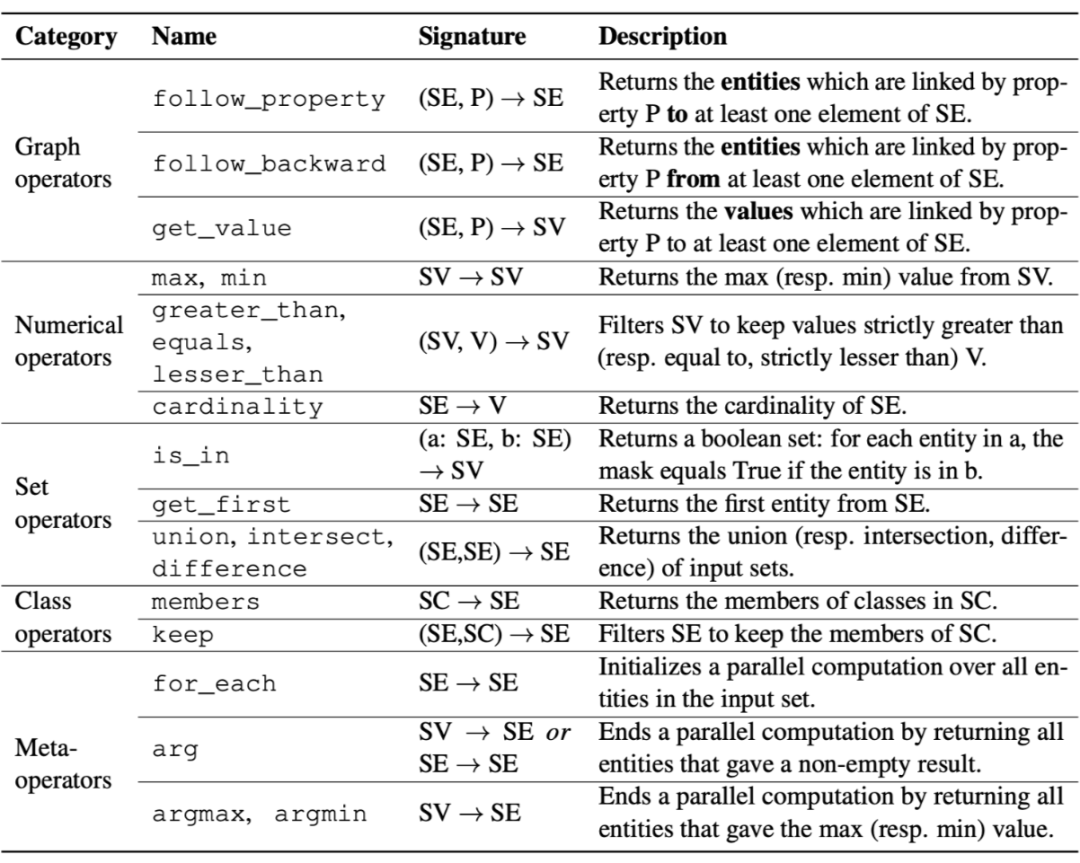 先前的几个 KG-QA 作品都是基于 D2A 的语法。作者重新设计语法以对更广泛的查询进行建模。通过定义更通用的运算符,作者在不增加运算符数量和 LF 平均深度的情况下实现了这一点。实体是 KG 中的一个节点。两个实体可以通过称为属性的有向标记边相关联。属性还可以将实体与值相关联,该值可以是日期、布尔值、数量或字符串。实体和属性有几个类型,主要是名称和整数 ID。成员属性将成员实体与类实体联系起来。