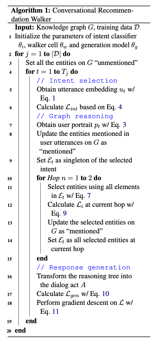 上图是 CR-Walker 的整体架构。右边是单个 Walker 单元的详细结构, Walker 单元计算图上的实体与集成了话语嵌入和用户画像的上下文嵌入之间的相似性。通过逻辑回归学习实体选择以实现多选。下图是 CR-Walker 的具体算法。