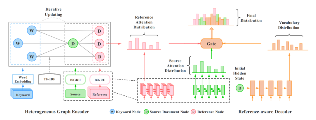 上图是本文提出的的 GATER (Graph ATtention network basEd on References) 模型的图示。首先使用源文档检索引用,其中每个引用都是来自训练集中的文档和关键短语对的串联。然后构建一个异构图并进行迭代更新。最后,提取源文档节点以使用分层注意和复制机制对关键短语序列进行解码。