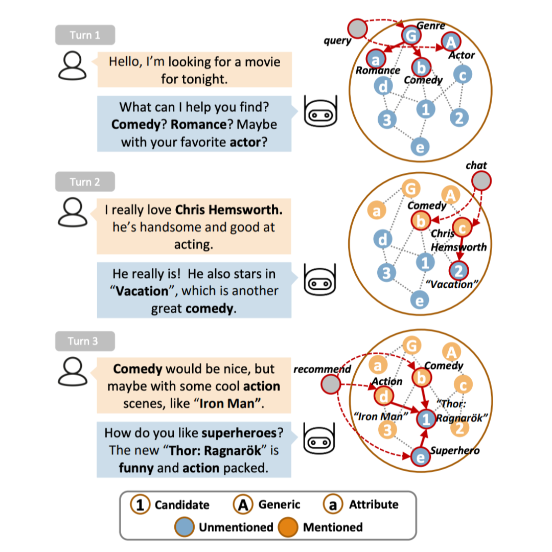 CRS 的第一个挑战是如何推理背景知识以获得准确推荐。上图是示例对话的前三轮。该对话显示在左侧,KG 上的实体以粗体显示。每个对话右边的图展示了 CR-Walker 的推理过程,推理树标记为红色。在整篇论文中,候选项目用数字标注,通用类/属性用大写/小写字母标注。橙色/蓝色表示实体在前面的上下文中被提及/未提及。