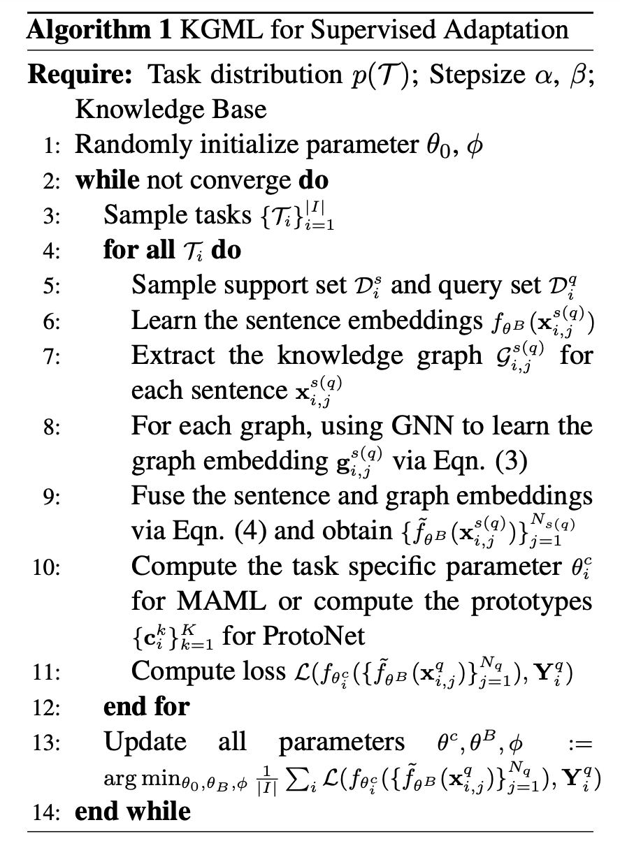 元学习在仅从当前元学习算法采用的历史任务中学习知识,没有得到训练任务的良好支持时,可能无法很好地推广到测试任务。这篇文章研究了一个低资源文本分类问题,并通过利用外部知识库弥合了元训练和元测试任务之间的差距。具体来说,作者提出了一种新方法 KGML 为从提取的特定于句子的知识图中学习的每个句子引入额外的表示。在三个数据集上的大量实验证明了 KGML 在有监督适应和无监督适应设置下的有效性。