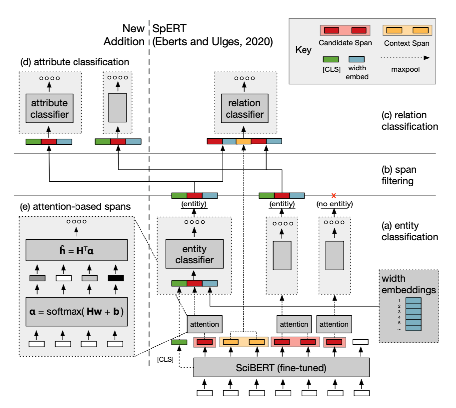 上图是作者对 SpERT 组件(a、b 和 c)的扩展具有多标签属性(d)和基于注意力的实体跨度表示(e)。