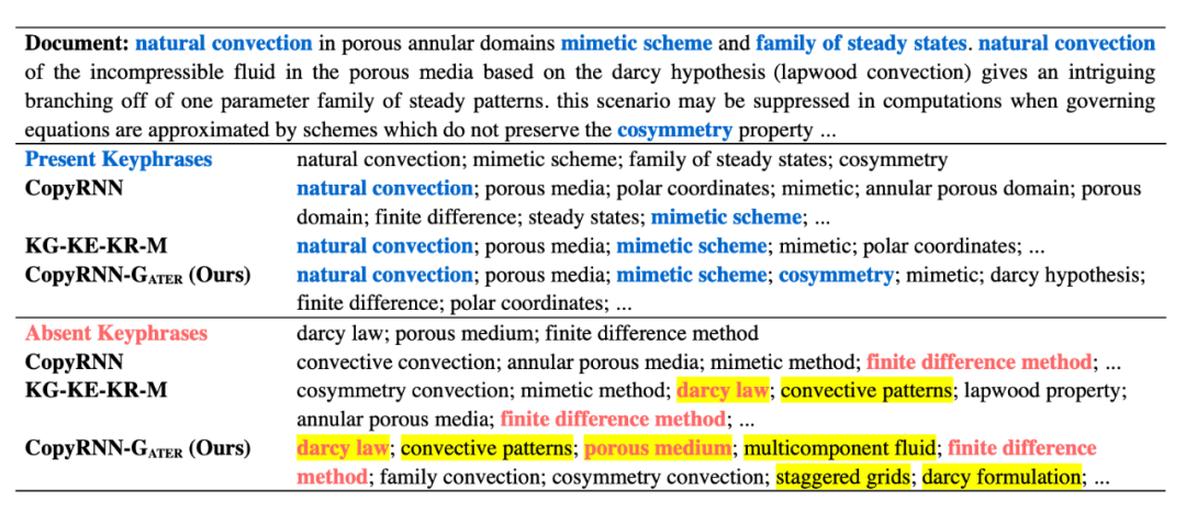 上图是不同模型生成的关键短语示例。对于当前和不存在的关键短语,正确的预测分别以粗体蓝色和粗体红色显示。参考文献中出现的缺失预测以黄色突出显示,其中只有检索到的文档的关键短语被视为 KG-KE-KR-M 的参考。