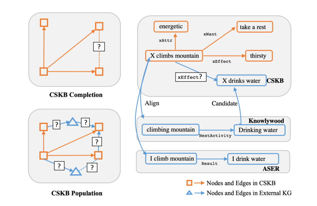 对元素为自由文本形式的常识知识库(commonsense knowledge bases, CSKB)进行推理是 NLP 中一项重要而艰巨的任务。虽然 CSKB 补全(completion)只填补了 CSKB 域内的缺失链接,但 CSKB 填充(population) 也被提出,目的是从外部资源中推理出看不见的断言。在此任务中,CSKB 以大规模事件(活动、状态和事件)图为基础,以区分来自事件图的新三元组是否合理。然而,现有的对 population 任务的评估要么不准确(使用随机采样的负样本进行自动评估)要么规模小(人工注释)。下图是补全任务和填充任务的对比。