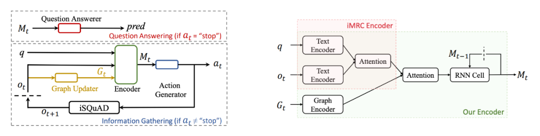 上图左边是本文代理的概览。作者建议使用图表示作为 iMRC 代理的附加输入模式。右边是从 iMRC 扩展而来的编码器模块的放大视图。作者建议在管道中添加一个新的图更新器模块和一个图编码层。具体来说,在步骤 t,图更新器将文本观察