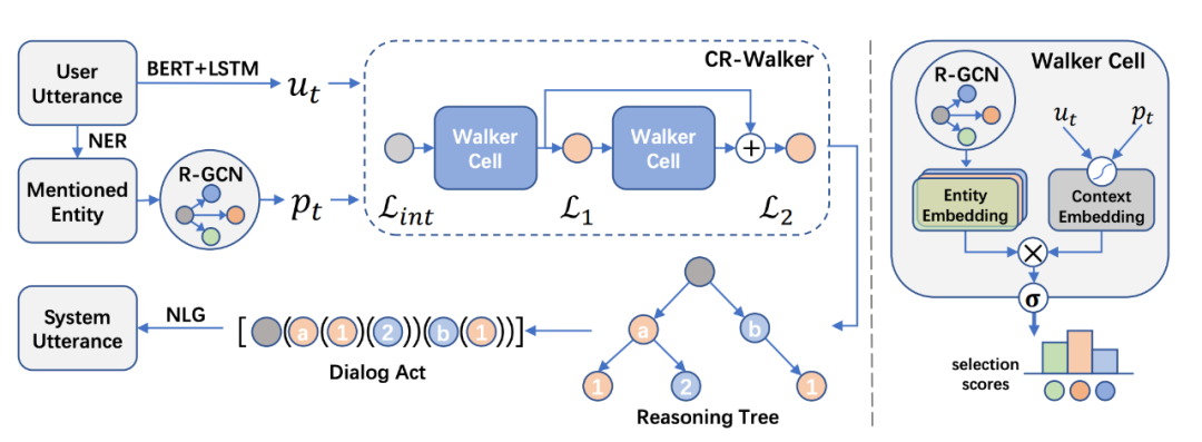 为了应对上述两个挑战,作者提出了 Conversational Recommendation Walker (CR-Walker)。模型首先选择一个系统意图来决定系统是询问信息、谈论某事还是提出建议。