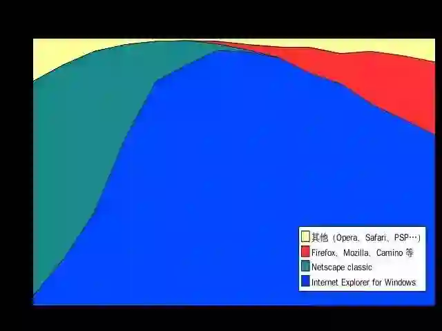 第一阶段是两巨头相争,微软的 IE 浏览器逐步取代网景的 Netscape,成为市占率第一的浏览器。