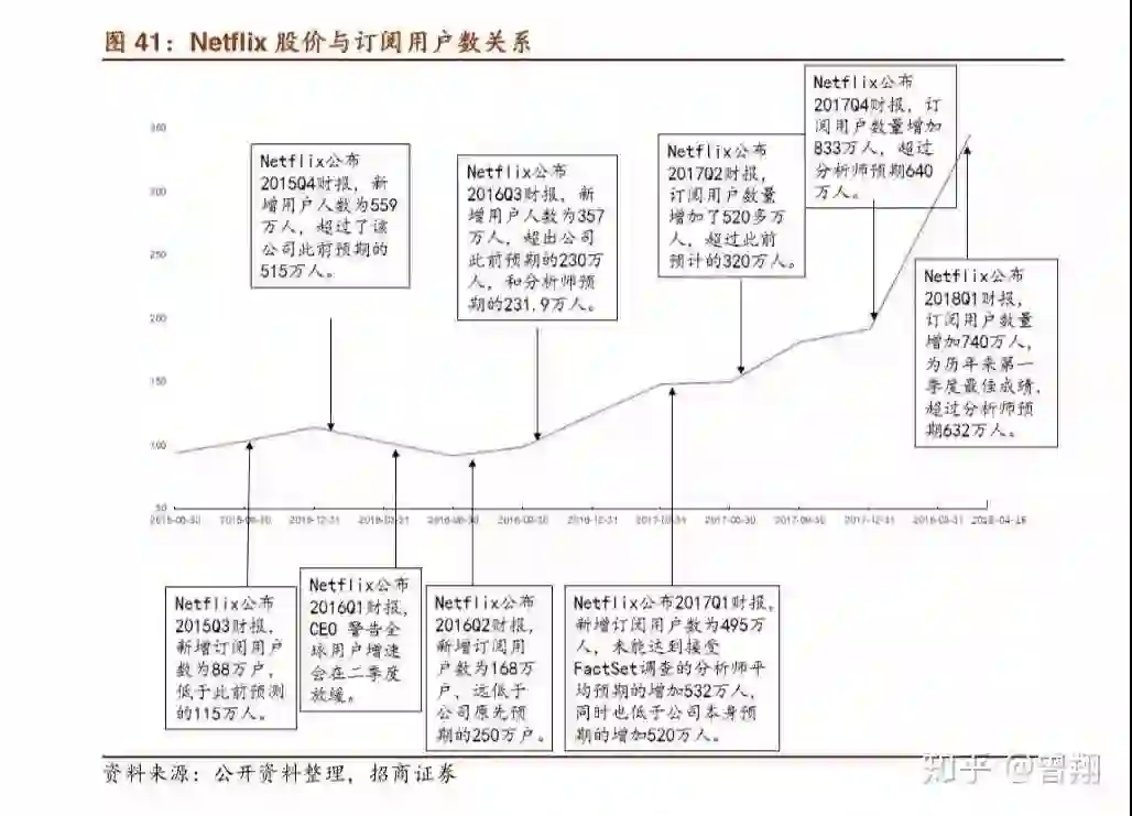 过去三年,几乎每季度的 Netflix 订阅用户量变化情况都会牵动大小股东的心,你会发现,市场真实情绪和未来预期都通过这个数据实时反馈到股价上。