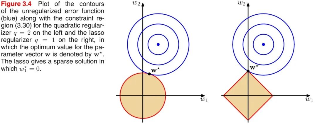 引入 PRML 一个经典的图来说明下 L1 和 L2 范数的区别,如下图所示: