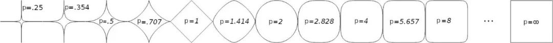 根据 𝑝 的变化,范数也有着不同的变化,借用一个经典的有关 P 范数的变化图如下: