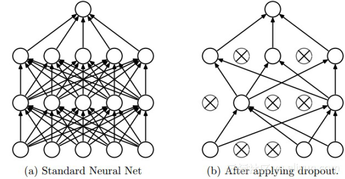 Dropout 是深度学习中经常采用的一种正则化方法。它的做法可以简单的理解为在 DNNs 训练的过程中以概率 𝑝 丢弃部分神经元,即使得被丢弃的神经元输出为 0。Dropout 可以实例化的表示为下图: