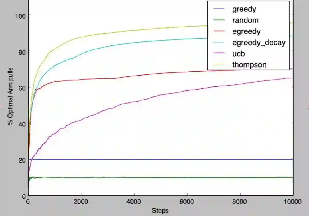 Thompson Sampling:每个臂维护一个beta(wins, lose)分布,每次用现有的beta分布产生一个随机数,选择随机数最大的臂。