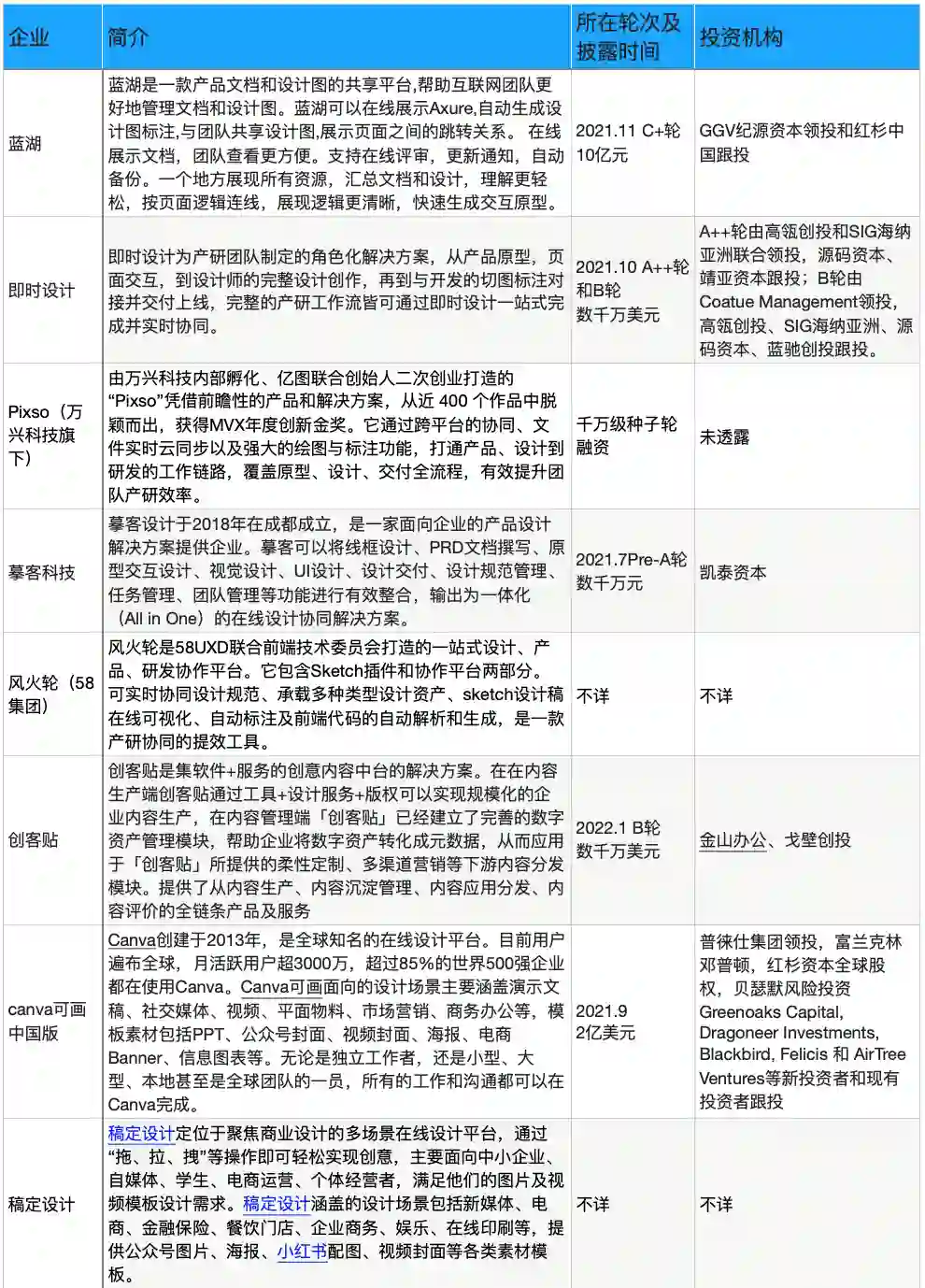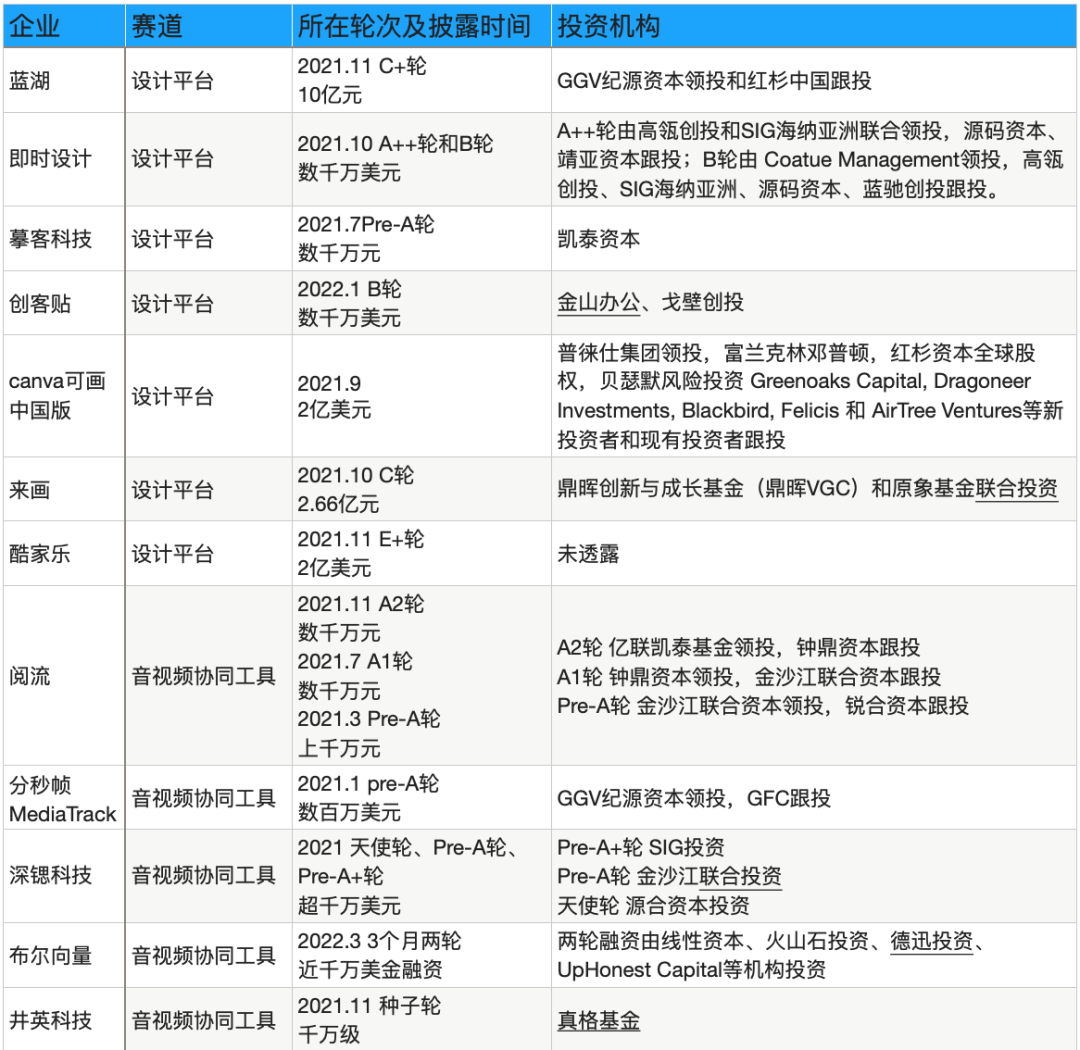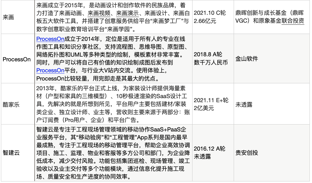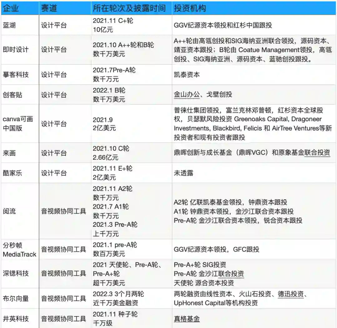 蓝湖自称为中国版Figma,C+轮融资高达10亿元,率先进入独角兽赛道;即时科技一年密集融到B轮;酷家乐完成E轮2亿美元融资,曾于2021年6月递交招股书;大厂飞书接入摹客;要做中国版“Adobe”的万兴科技布局Pixso并购墨刀;金山办公战略合作创客贴。