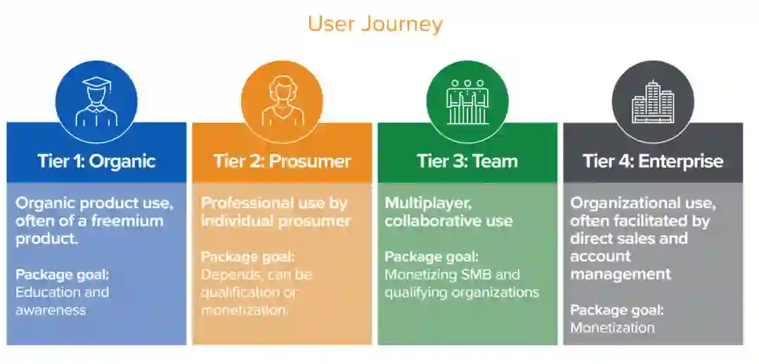 决策链路——自下而上的推荐和决策:个人使用——团队使用——企业试用——企业购买