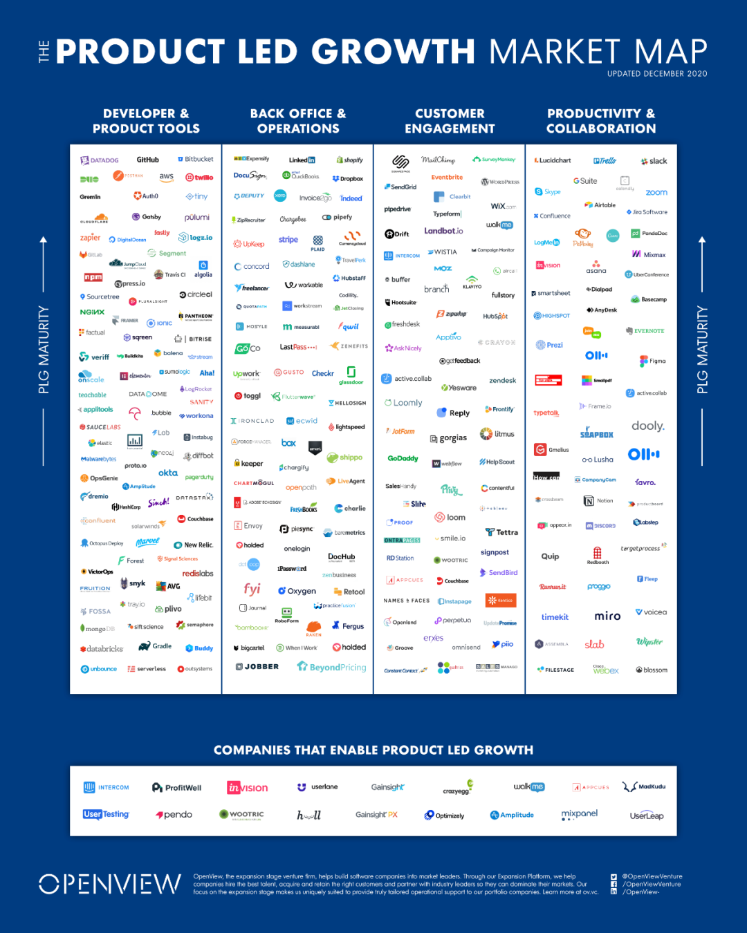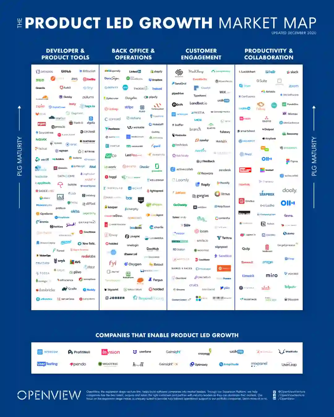 OpenView将符合PLG这一增长模式的企业分为四大类:开发者和产品工具、后台支持和运维、用户运营,以及生产力和协作工具。