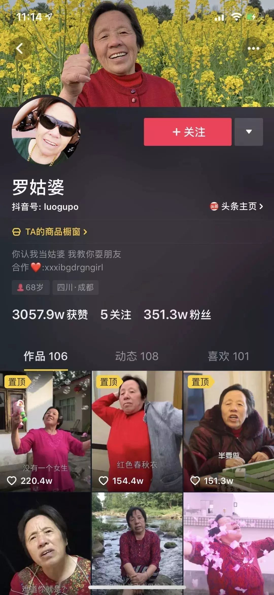 她还不是一个异类,根据燃经济的不完全统计:老姐姐老哥哥们都已经在抖音快手上争先恐后地火了起来,粉丝量高达百万……