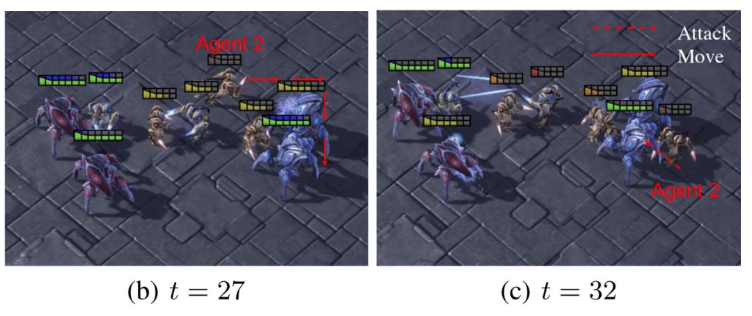 受伤的智能体 2 躲入血厚的智能体背后,并继续输出伤害。