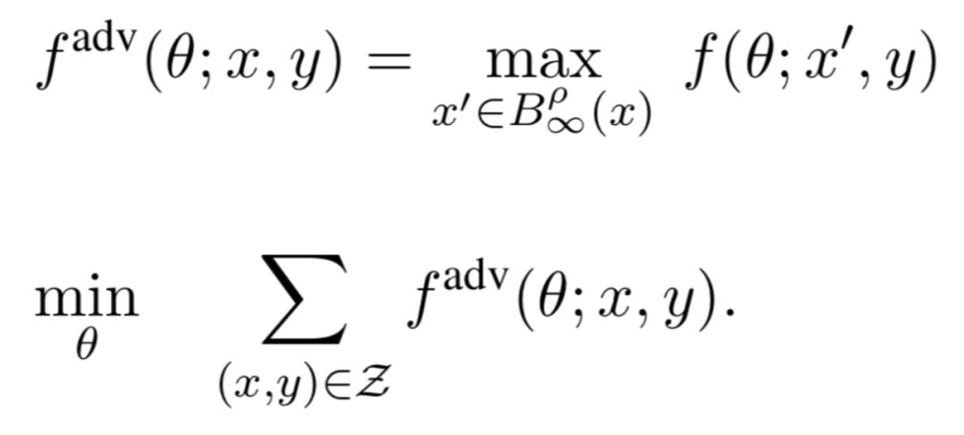 具体的,这种对抗性训练目标可以表示为如下两个方程,即最大化错误以获得对抗样本,最小化错误以获得准确的模型。