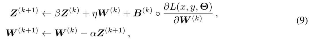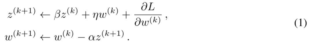 好了,该看看 GSM 的具体过程了,一般带动量的 SGD 如下所示,它会先计算一个累积的梯度,可以直观理解为下降小球的「惯性」。学习算法会根据这样的惯性找到更新方向,并更新对应的权重。