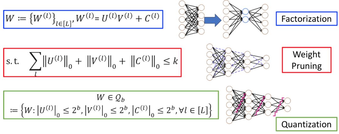 如下所示分别为权重分解、剪枝和量化三种约束条件。权重 W 为某个卷积层的权重矩阵,