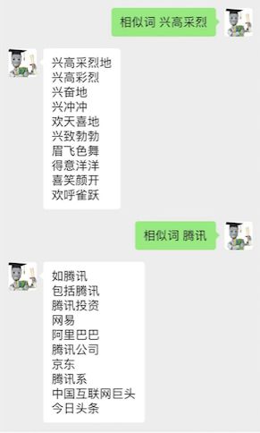 当然官方的说法归官方,我还是遇到了一些bad case,例如输入官方例子 "相似词 兴高采烈" 和输入"相似词 腾讯",我们会发现一些"bad case":