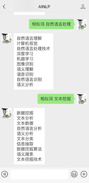 周末闲来无事,给AINLP公众号聊天机器人加了一个技能点:中文相似词查询功能,基于腾讯 AI Lab 之前公布的一个大规模的中文词向量,例如在公众号对话窗口输入"相似词 自然语言处理",会得到:自然语言理解、计算机视觉、自然语言处理技术、深度学习、机器学习、图像识别、语义理解、语音识别、自然语言识别、语义分析;输入"相似词 文本挖掘",会得到:数据挖掘、文本分析、文本数据、自然语言分析、语义分析、文本分类、信息抽取、数据挖掘算法、语义搜索、文本挖掘技术。如下图所示: